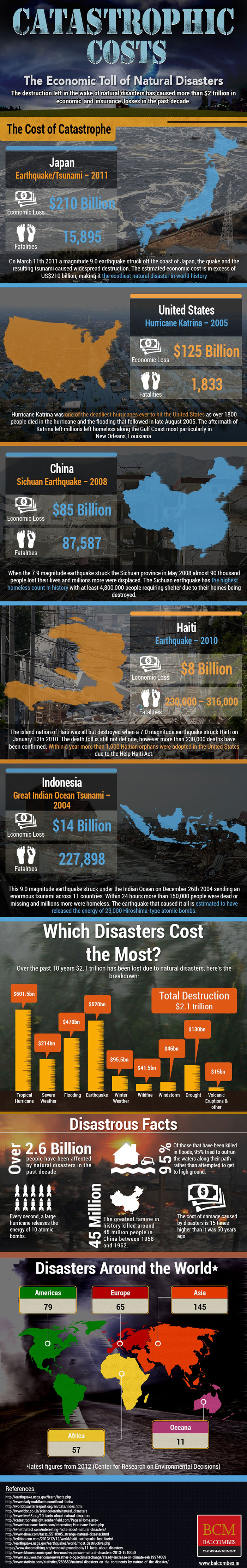 Balcombes Claims Management recently shared an infographic displaying the catastrophic costs around the world caused by natural disasters. From earthquakes in Japan, China, and Haiti, to the ongoing typhoons in Indonesia, the financial amounts are staggering. Can the economic toll from future disasters like these be reduced?